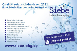 Die Siebe Gebäudereinigung OHG ist ein inhabergeführtes Familienunternehmen, Mitglied der Gebäudereiniger-Innung, Ausbildungsbetrieb und als präqualifiziertes Unternehmen im amtlichen Verzeichnis der IHK für den Liefer- und Dienstleistungsbereich gelistet. Das Dienstleistungsunternehmen Siebe Gebäudereinigung OHG bietet ein breites Spektrum von der Solar- und Photovoltaikreinigung über Unterhaltsreinigung, Treppenhausreinigung, Glas- und Rahmenreinigung, Aussenreinigung & Pflege, Hausmeisterservice, Bauschlussreinigung, Fassadenreinigung, Dachreinigung, Sonderreinigung und Winterdienst. Das Einzugsgebiet des Gebäudedienstleisters fokussiert sich auf das westliche Ruhrgebiet.